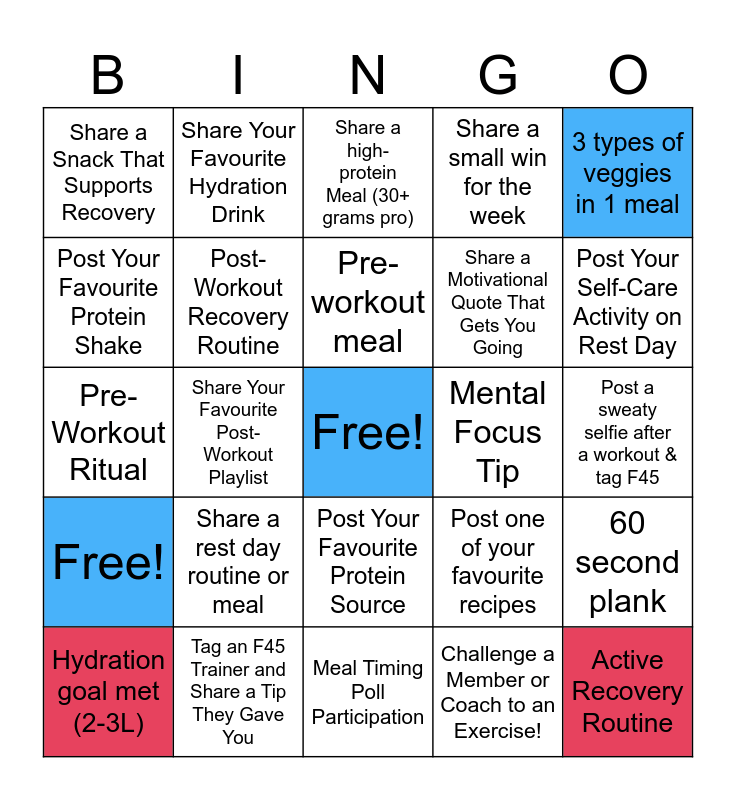 This bingo card has a free space and 24 words: Hydration goal met (2-3L), Share a rest day routine or meal, Pre-workout meal, Challenge a Member or Coach to an Exercise!, 3 types of veggies in 1 meal, Share a Snack That Supports Recovery, Share Your Favourite Hydration Drink, Share a high- protein Meal (30+ grams pro), Mental Focus Tip, Post a sweaty selfie after a workout & tag F45, Pre- Workout Ritual, Post- Workout Recovery Routine, Post one of your favourite recipes, 60 second plank, Post Your Favourite Protein Shake, Tag an F45 Trainer and Share a Tip They Gave You, Meal Timing Poll Participation, Share a small win for the week, Post Your Self-Care Activity on Rest Day, Free!, Share Your Favourite Post-Workout Playlist, Post Your Favourite Protein Source, Share a Motivational Quote That Gets You Going and Active Recovery Routine.