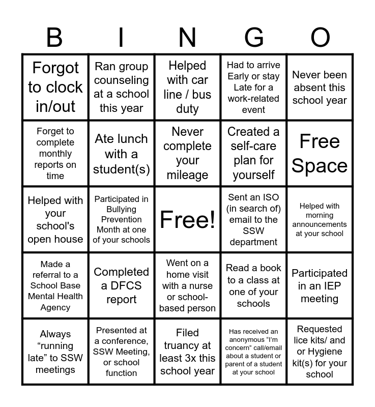 This bingo card has a free space and 25 words: Completed a DFCS report, Filed truancy at least 3x this school year, Never complete your mileage, Always “running late” to SSW meetings, Never been absent this school year, Forgot to clock in/out, Forget to complete monthly reports on time, Ran group counseling at a school this year, Sent an ISO (in search of) email to the SSW department, Went on a home visit with a nurse or school-based person, Created a self-care plan for yourself, Helped with your school's open house, Read a book to a class at one of your schools, Participated in an IEP meeting, Ate lunch with a student(s), Helped with morning announcements at your school, Helped with morning announcements at your school, Helped with car line / bus duty, Free Space, Participated in Bullying Prevention Month at one of your schools, Requested lice kits/ and or Hygiene kit(s) for your school, Presented at a conference, SSW Meeting, or school function, Made a referral to a School Base Mental Health Agency, Had to arrive Early or stay Late for a work-related event and Has received an anonymous “I’m concern” call/email about a student or parent of a student at your school.