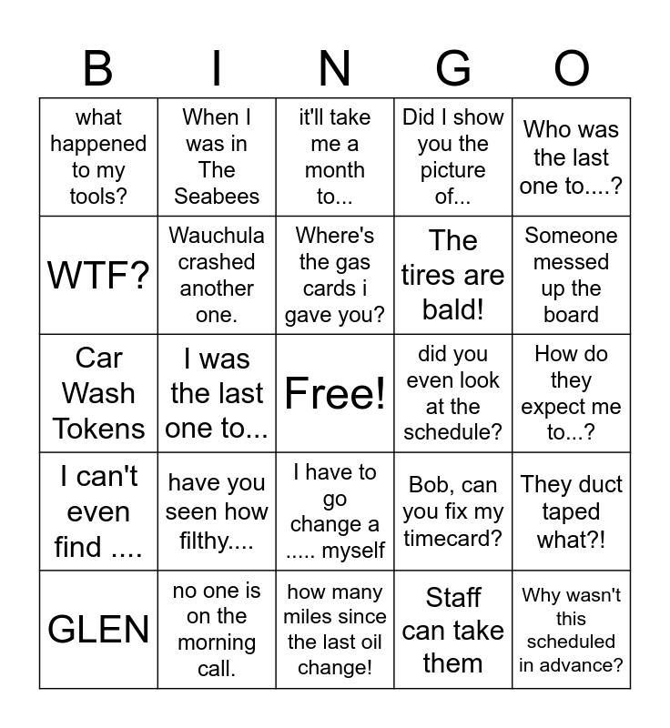 This bingo card has a free space and 29 words: GLEN, where's this van?, I was the last one to..., Drivers meeting at Der Dutchman, what happened to my tools?, it'll take me a month to..., Wauchula crashed another one., have you seen how filthy...., did you even look at the schedule?, no one is on the morning call., How do they expect me to...?, Why wasn't this scheduled in advance?, how many miles since the last oil change!, Staff can take them, Someone messed up the board, why have you not cleaned the vans?, I have to go change a ..... myself, I can't even find ...., Who was the last one to....?, Car Wash Tokens, Bob, can you fix my timecard?, why are you not up to date in Relias?, The tires are bald!, WTF?, Did I show you the picture of..., When I was in The Seabees, They duct taped what?!, Where's the gas cards i gave you? and It's after 8pm, past my bedtime..