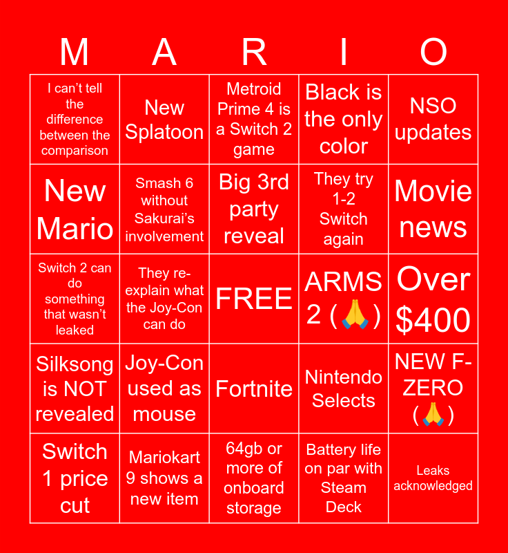 This bingo card has a free space and 24 words: Joy-Con used as mouse, Mariokart 9 shows a new item, Big 3rd party reveal, Switch 1 price cut, NSO updates, I can’t tell the difference between the comparison, New Mario, New Splatoon, ARMS 2 (🙏), Fortnite, They try 1-2 Switch again, Switch 2 can do something that wasn’t leaked, Nintendo Selects, NEW F-ZERO (🙏), Smash 6 without Sakurai’s involvement, Battery life on par with Steam Deck, Over $400, Metroid Prime 4 is a Switch 2 game, Movie news, They re-explain what the Joy-Con can do, Leaks acknowledged, Silksong is NOT revealed, Black is the only color and 64gb or more of onboard storage.