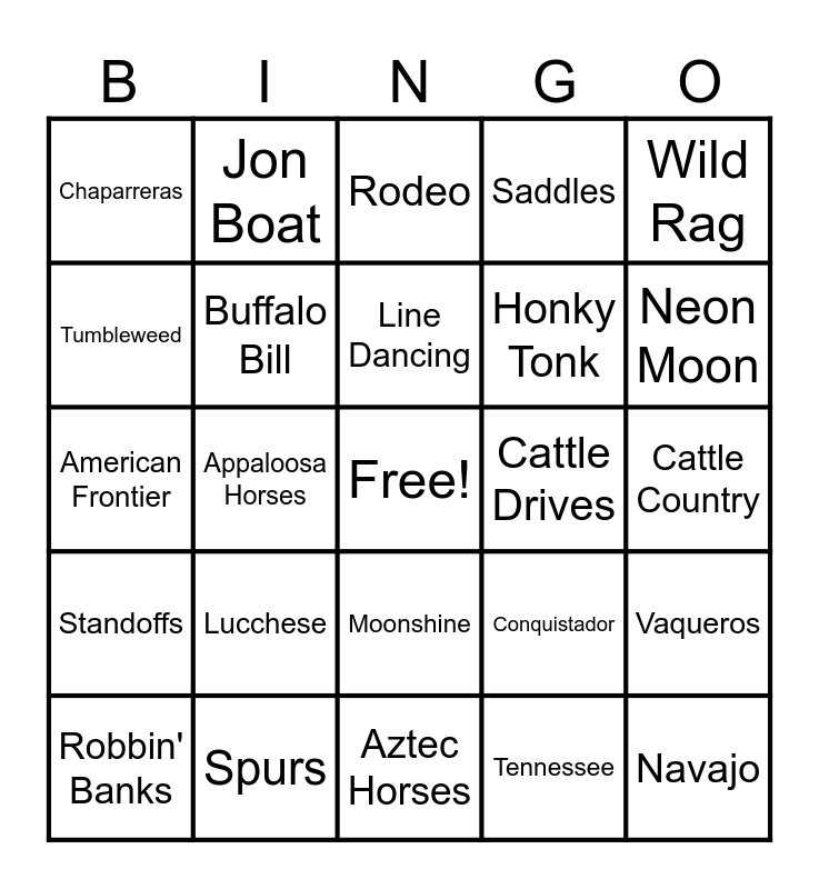 This bingo card has a free space and 36 words: Stetson, Siksika, Lasso, Buffalo Bill, Conquistador, Standoffs, Line Dancing, Ranchers, Wild Rag, Railways, Appaloosa Horses, Saddles, Travois, Cattle Drives, Neon Moon, Chaparreras, Blue Lighting, Lucchese, Navajo, Rodeo, Cattle Country, Vaqueros, Spurs, Robbin' Banks, Aztec Horses, Jon Boat, American Frontier, Wild Wild West, Honky Tonk, Tumbleweed, Bourbon, Whiskey, Tennessee, Moonshine, Manifest Destiny and Texas.