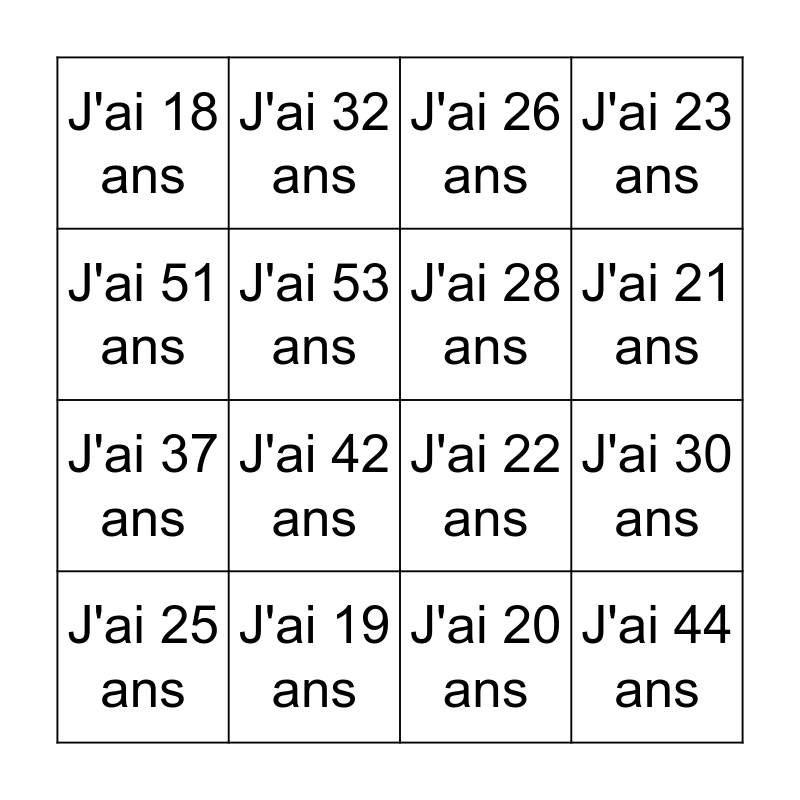 Tu as quel âge ? | french bingo | French Numbers & Greetings | French Numbers & Greetings | BINGO HUMAIN