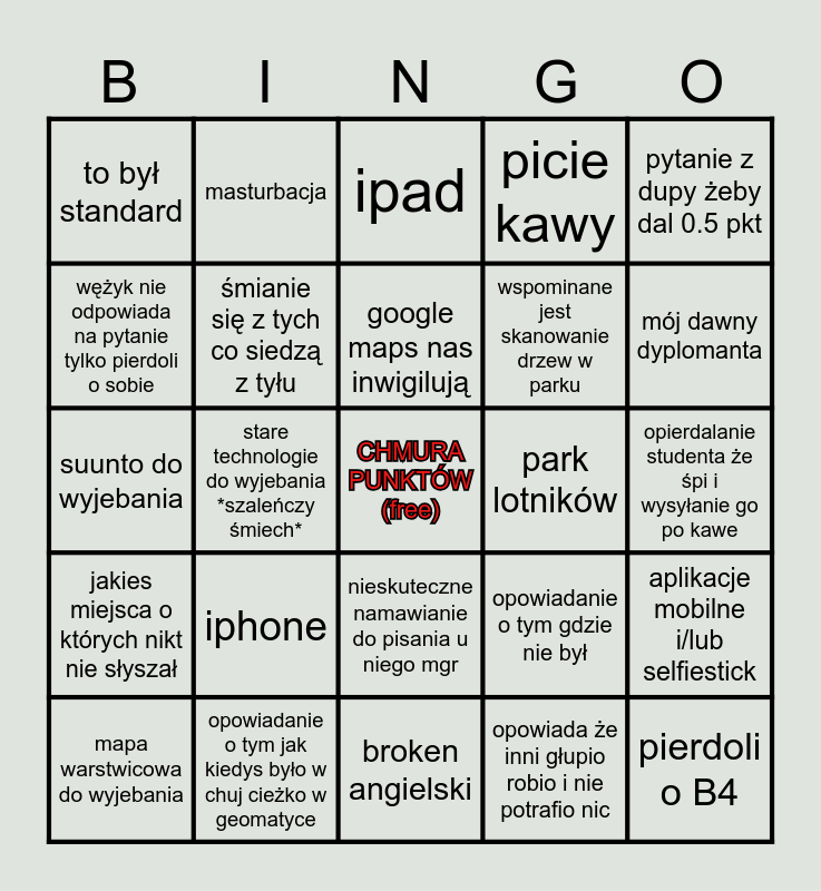 This bingo card has a free space and 24 words: iphone, opowiadanie o tym jak kiedys było w chuj cieżko w geomatyce, google maps nas inwigilują, mapa warstwicowa do wyjebania, pytanie z dupy żeby dal 0.5 pkt, to był standard, wężyk nie odpowiada na pytanie tylko pierdoli o sobie, masturbacja, park lotników, nieskuteczne namawianie do pisania u niego mgr, wspominane jest skanowanie drzew w parku, suunto do wyjebania, opowiadanie o tym gdzie nie był, aplikacje mobilne i/lub selfiestick, śmianie się z tych co siedzą z tyłu, opowiada że inni głupio robio i nie potrafio nic, opierdalanie studenta że śpi i wysyłanie go po kawe, ipad, mój dawny dyplomanta, stare technologie do wyjebania *szaleńczy śmiech*, pierdoli o B4, jakies miejsca o których nikt nie słyszał, picie kawy and broken angielski.