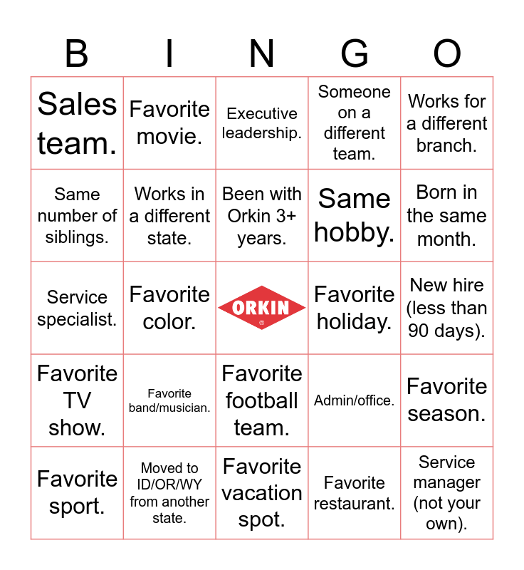 This bingo card has a free space and 24 words: Favorite band/musician., Moved to ID/OR/WY from another state., Been with Orkin 3+ years., Favorite sport., Works for a different branch., Sales team., Same number of siblings., Favorite movie., Favorite holiday., Favorite football team., Same hobby., Service specialist., Admin/office., Favorite season., Works in a different state., Favorite restaurant., New hire (less than 90 days)., Executive leadership., Born in the same month., Favorite color., Service manager (not your own)., Favorite TV show., Someone on a different team. and Favorite vacation spot..