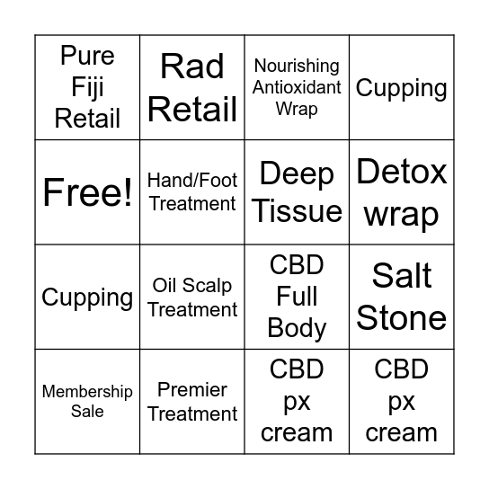This bingo card has 16 words: Premier Treatment, Salt Stone, Nourishing Antioxidant Wrap, Pure Fiji Retail, Cupping, Rad Retail, CBD Full Body, CBD px cream, Free!, Hand/Foot Treatment, Membership Sale, Cupping, Oil Scalp Treatment, Detox wrap, Deep Tissue and CBD px cream.