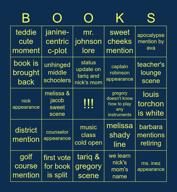 This bingo card has a free space and 24 words: counselor appearance, first vote for book is split, status update on tariq and nick's mom, golf course mention, apocalypse mention by ava, teddie cute moment, book is brought back, janine-centric c-plot, gregory doesn't know how to play any instruments, music class cold open, captain robinson appearance, nick appearance, melissa shady line, barbara mentions retiring, unhinged middle schoolers, we learn nick's mom's name, louis torchon is white, mr. johnson lore, teacher's lounge scene, melissa & jacob sweet scene, ms. inez appearance, district mention, sweet cheeks mention and tariq & gregory scene.