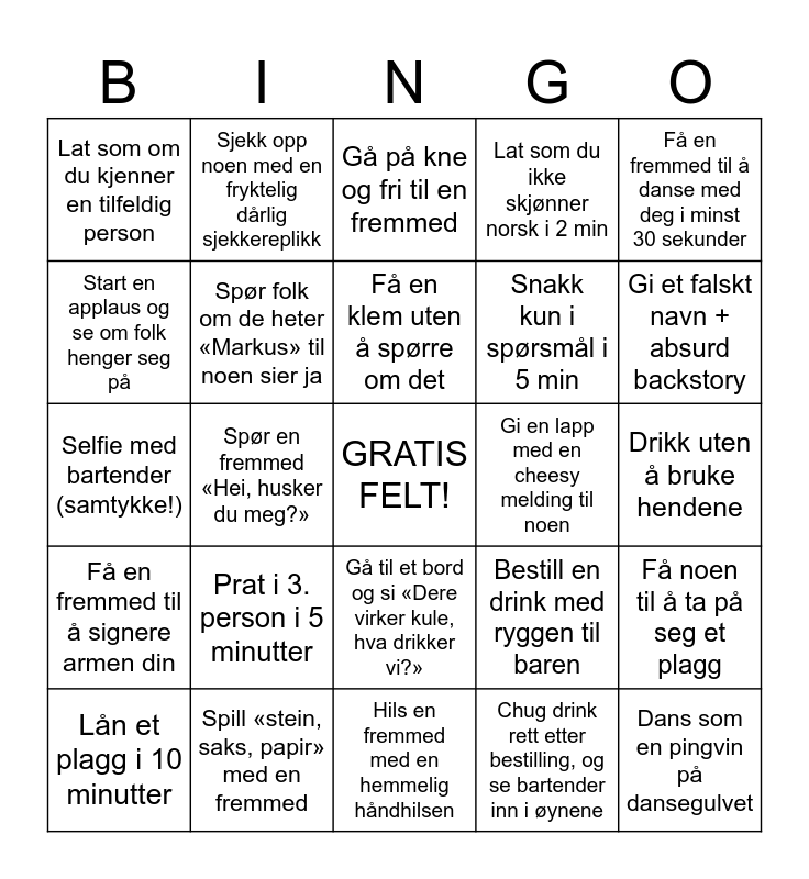 This bingo card has a free space and 24 words: Lån et plagg i 10 minutter, Prat i 3. person i 5 minutter, Få en klem uten å spørre om det, Chug drink rett etter bestilling, og se bartender inn i øynene, Få en fremmed til å danse med deg i minst 30 sekunder, Lat som om du kjenner en tilfeldig person, Sjekk opp noen med en fryktelig dårlig sjekkereplikk, Gå på kne og fri til en fremmed, Gi en lapp med en cheesy melding til noen, Drikk uten å bruke hendene, Selfie med bartender (samtykke!), Spør folk om de heter «Markus» til noen sier ja, Bestill en drink med ryggen til baren, Få noen til å ta på seg et plagg, Start en applaus og se om folk henger seg på, Spill «stein, saks, papir» med en fremmed, Hils en fremmed med en hemmelig håndhilsen, Lat som du ikke skjønner norsk i 2 min, Gi et falskt navn + absurd backstory, Få en fremmed til å signere armen din, Spør en fremmed «Hei, husker du meg?», Gå til et bord og si «Dere virker kule, hva drikker vi?», Snakk kun i spørsmål i 5 min and Dans som en pingvin på dansegulvet.