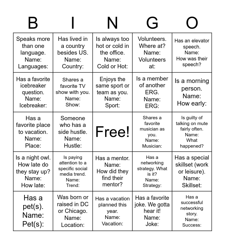 This bingo card has a free space and 24 words: Is paying attention to a specific social media trend. Name: Trend:, Was born or raised in DC or Chicago. Name: Location:, Enjoys the same sport or team as you. Name: Sport:, Has a pet(s). Name: Pet(s):, Has an elevator speech. Name: How was their speech?, Speaks more than one language. Name: Languages:, Has a favorite icebreaker question. Name: Icebreaker:, Has lived in a country besides US. Name: Country:, Shares a favorite musician as you. Name: Musician:, Has a mentor. Name: How did they find their mentor?, Is a member of another ERG. Name: ERG:, Has a favorite place to vacation. Name: Place:, Has a networking strategy. What is it? Name: Strategy:, Has a special skillset (work or leisure). Name: Skillset:, Shares a favorite TV show with you. Name: Show:, Has a favorite joke. We gotta hear it! Name: Joke:, Is guilty of talking on mute fairly often. Name: What happened?, Is always too hot or cold in the office. Name: Cold or Hot:, Is a morning person. Name: How early:, Someone who has a side hustle. Name: Hustle:, Has a successful networking story. Name: Success:, Is a night owl. How late do they stay up? Name: How late:, Volunteers. Where at? Name: Volunteers at: and Has a vacation planned this year. Name: Vacation:.