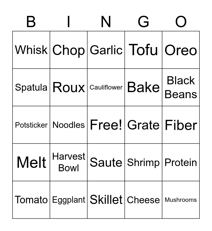 This bingo card has a free space and 24 words: Harvest Bowl, Eggplant, Cauliflower, Tomato, Oreo, Whisk, Spatula, Chop, Grate, Saute, Bake, Potsticker, Shrimp, Protein, Roux, Cheese, Fiber, Garlic, Black Beans, Noodles, Mushrooms, Melt, Tofu and Skillet.
