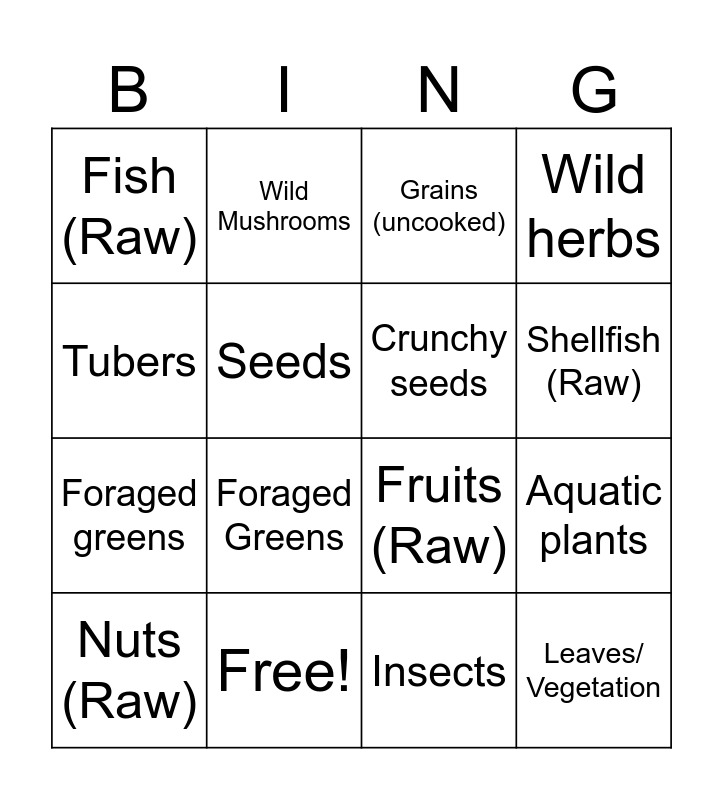 This bingo card has 24 words: Meat (Raw), Eggs (Raw), Shellfish (Raw), Tree Sap, Tubers, Fish (Raw), Seeds, Wild Mushrooms, Free!, Berry Clusters, Foraged greens, Fruits (Raw), Honey, Game meat (raw), Crunchy seeds, Roots (Raw), Insects, Grains (uncooked), Foraged Greens, Aquatic plants, Nuts (Raw), Leaves/ Vegetation, Wild herbs and Edible Flowers.