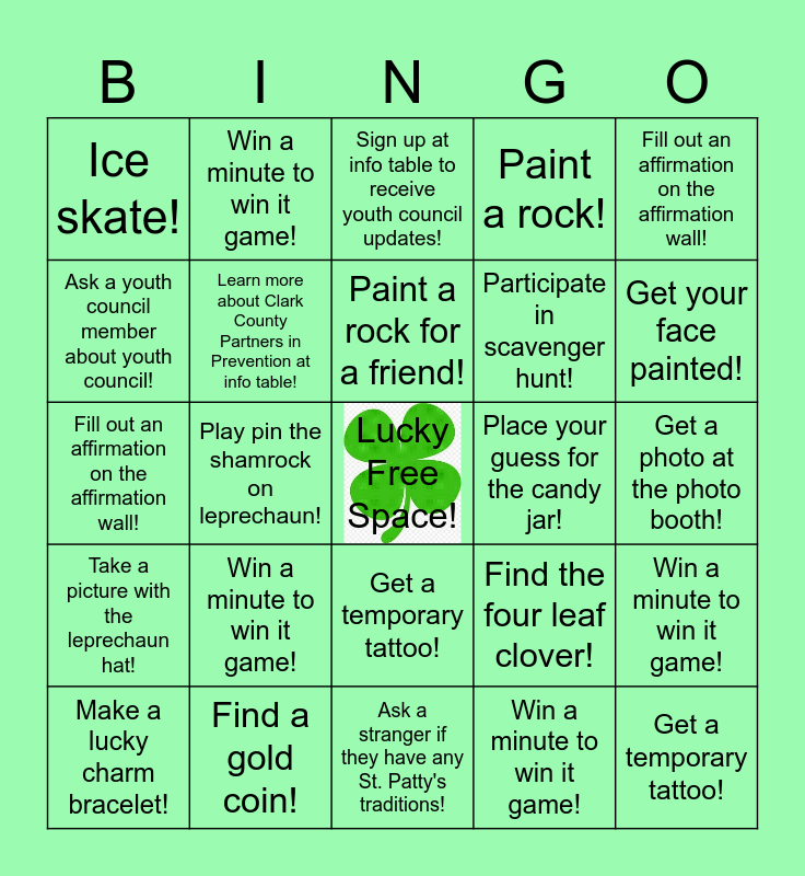 This bingo card has a free space and 24 words: Win a minute to win it game!, Find a gold coin!, Paint a rock for a friend!, Make a lucky charm bracelet!, Fill out an affirmation on the affirmation wall!, Ice skate!, Ask a youth council member about youth council!, Win a minute to win it game!, Place your guess for the candy jar!, Get a temporary tattoo!, Participate in scavenger hunt!, Fill out an affirmation on the affirmation wall!, Find the four leaf clover!, Win a minute to win it game!, Learn more about Clark County Partners in Prevention at info table!, Win a minute to win it game!, Get a photo at the photo booth!, Sign up at info table to receive youth council updates!, Get your face painted!, Play pin the shamrock on leprechaun!, Get a temporary tattoo!, Take a picture with the leprechaun hat!, Paint a rock! and Ask a stranger if they have any St. Patty's traditions!.