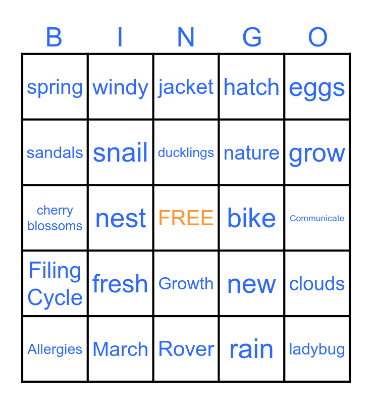 This bingo card has a free space and 109 words: April, bees, bike, bird, bloom, blossom, break, breeze, brisk, buds, bugs, bulbs, bunny, butterfly, buzzing, caterpillar, cherry blossoms, chicks, chirp, cleaning, clouds, daisies, dandelions, dragonfly, drizzle, ducklings, eggs, flowers, gardening, green, grow, hatch, jacket, kite, kitten, ladybug, lamb, leaf, March, May, melt, mud, nature, nest, new, outside, plant, pollen, puddle, puppies, rabbit, raccoons, rain, rainbow, robin, season, seeds, shovel, showers, snail, spring, sprout, sunny, thaw, tree, tulip, umbrella, warm, weather, weeds, wet, windy, Filing Cycle, Prepayments, Due Dates, Squads, Communicate, Red Light, Automation, Transmission, Skyscraper, Pre-Cycle, sports, bubbles, camping, sunshine, park, picnic, sandals, equinox, restart, fresh, pleasant, DNP, sneezy, vacation, holidays, Testing, Rover, CO Locals, Tent, Pollen, Allergies, Growth, Change, Goals, VFE, playground and slide.