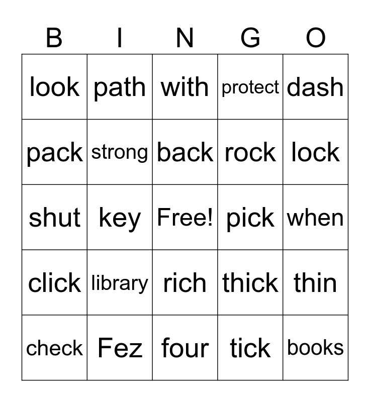 This bingo card has a free space and 24 words: library, Fez, back, check, dash, look, pack, path, pick, rich, rock, shut, thick, thin, strong, tick, when, with, lock, key, books, click, protect and four.