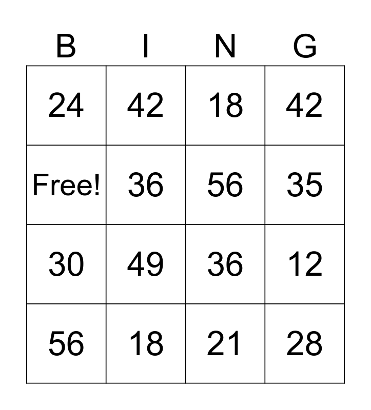 This bingo card has 16 words: 18, 12, 18, 24, 30, 42, 36, 21, Free!, 36, 56, 42, 49, 35, 56 and 28.