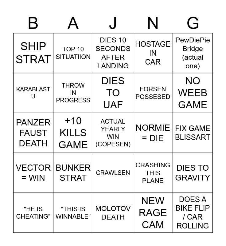 This bingo card has a free space and 24 words: BUNKER STRAT, "THIS IS WINNABLE", DIES TO UAF, "HE IS CHEATING", PewDiePie Bridge (actual one), SHIP STRAT, KARABLAST U, TOP 10 SITUATIION, NORMIE = DIE, CRAWLSEN, FORSEN POSSESED, PANZER FAUST DEATH, CRASHING THIS PLANE, DIES TO GRAVITY, THROW IN PROGRESS, NEW RAGE CAM, FIX GAME BLISSART, DIES 10 SECONDS AFTER LANDING, NO WEEB GAME, +10 KILLS GAME, DOES A BIKE FLIP / CAR ROLLING, VECTOR = WIN, HOSTAGE IN CAR and MOLOTOV DEATH.