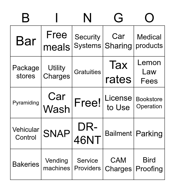 This bingo card has a free space and 24 words: SNAP, Vending machines, Gratuities, Bakeries, Medical products, Bar, Package stores, Free meals, License to Use, DR-46NT, Tax rates, Pyramiding, Bailment, Parking, Utility Charges, CAM Charges, Bookstore Operation, Security Systems, Lemon Law Fees, Car Wash, Bird Proofing, Vehicular Control, Car Sharing and Service Providers.