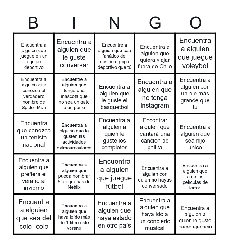 This bingo card has 25 words: Encuentra a alguien que pueda nombrar 5 programas de Netflix, Encuentra a alguien que haya estado en otro país, Encuentra a alguien que le guste el basquetbol, Encuentra a alguien que sea del colo -colo, Encuentra a alguien que juegue voleybol, Encuentra a alguien que juegue en un equipo deportivo, Encuentra a alguien que conozca el verdadero nombre de Spider-Man, Encuentra a alguien que le guste conversar, Encontrar alguien que cantará una canción de pailita, Encuentra a alguien que juegue fútbol, Encuentra a alguien que no tenga instagram, Encuentra que conozca un tenista nacional, Encuentra a alguien con quien no hayas conversado, Encuentra a alguien que ame las películas de terror., Encuentre a alguien que tenga una mascota que no sea un gato o un perro, Encuentra a alguien a quien le guste hacer ejercicio, Encuentra a alguien que sea hijo único, Encuentre a alguien que sea fanático del mismo equipo deportivo que tú, Encuentra a alguien con un pie más grande que tú, Encuentra a alguien que le gusten las actividades extracurriculares, Encuentra a alguien a quien le guste los completos, Encuentra a alguien que haya leído más de 1 libro este verano, Encuentra a alguien que prefiera el verano al invierno, Encuentra a alguien que quiera viajar fuera de Chile and Encuentra a alguien que haya ido a un concierto musical.