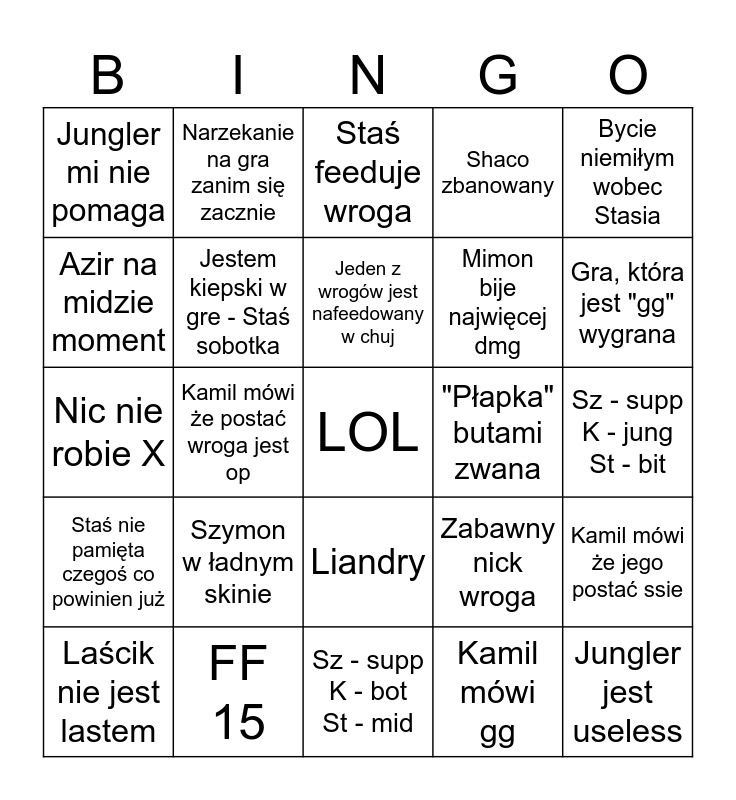 This bingo card has a free space and 24 words: Szymon w ładnym skinie, FF 15, Jeden z wrogów jest nafeedowany w chuj, Laścik nie jest lastem, Bycie niemiłym wobec Stasia, Jungler mi nie pomaga, Azir na midzie moment, Narzekanie na gra zanim się zacznie, "Płapka" butami zwana, Liandry, Mimon bije najwięcej dmg, Nic nie robie X, Zabawny nick wroga, Kamil mówi że jego postać ssie, Jestem kiepski w gre - Staś sobotka, Kamil mówi gg, Sz - supp K - jung St - bit, Staś feeduje wroga, Gra, która jest "gg" wygrana, Kamil mówi że postać wroga jest op, Jungler jest useless, Staś nie pamięta czegoś co powinien już, Shaco zbanowany and Sz - supp K - bot St - mid.