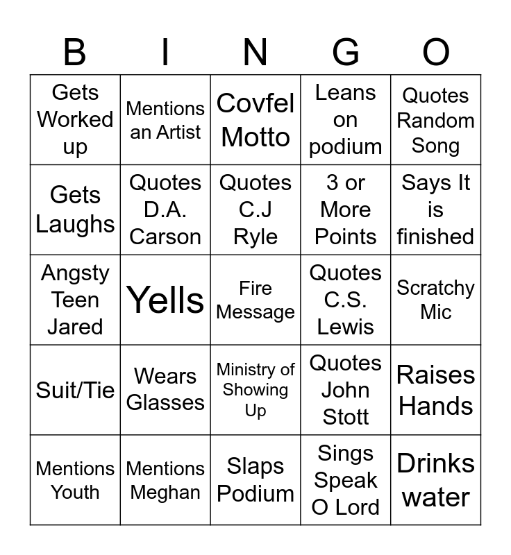 This bingo card has a free space and 34 words: Quotes Spurgeon, Sings Speak O Lord, Mentions Narnia, Mentions His Kids, Suit/Tie, Quotes D.A. Carson, Quotes Random Song, Mentions Youth, Mentions an Artist, Floral Shirt, Quotes C.J Ryle, Covfel Motto, Mentions Harry Potter, Wear Jordans On Stage, Quotes C.S. Lewis, Says It is finished, Mentions Meghan, Angsty Teen Jared, Wears Glasses, Quotes John Stott, Ministry of Showing Up, Mentions Lord of The Rings, Gets Worked up, Scratchy Mic, Slaps Podium, Drinks water, Leans on podium, Standing Ovation, 3 or More Points, Gets Laughs, Cries, Yells, Raises Hands and Out of breath.
