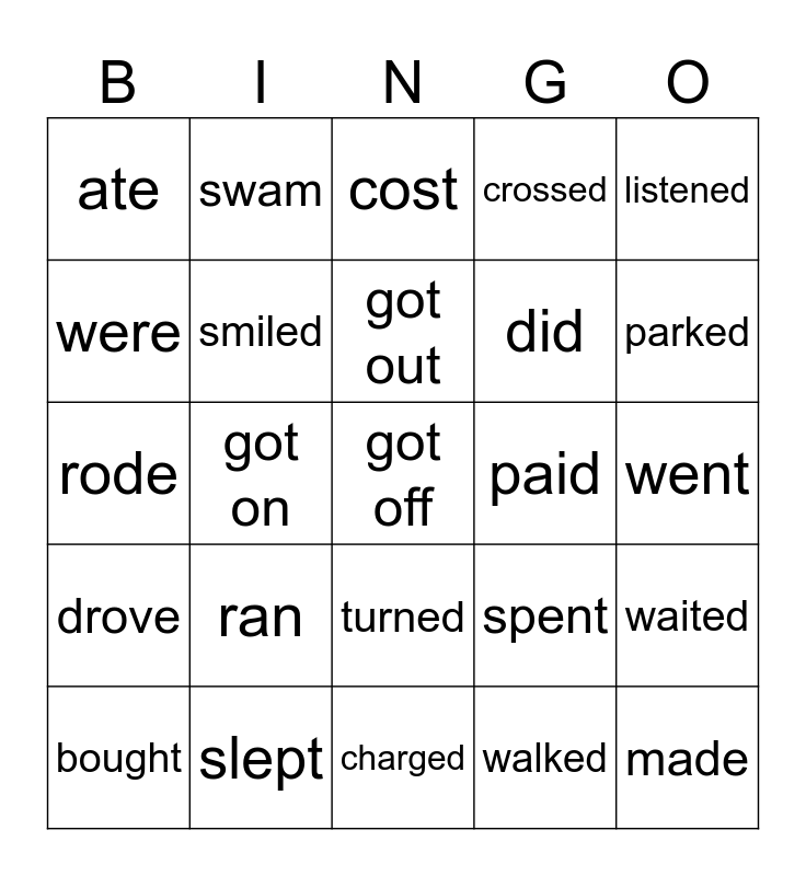 This bingo card has 29 words: bought, wrote, got on, made, ate, cost, smiled, ran, paid, slept, went, got off, charged, walked, parked, sold, turned, drove, listened, rode, spent, took, did, were, crossed, swam, waited, got out and got in.