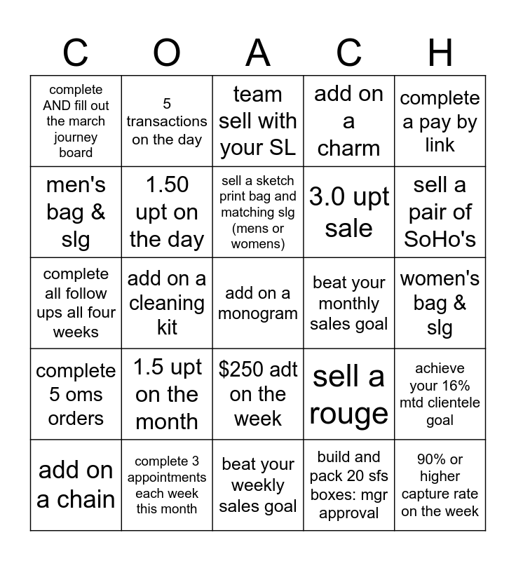 This bingo card has a free space and 24 words: 1.5 upt on the month, complete 3 appointments each week this month, sell a sketch print bag and matching slg (mens or womens), add on a chain, complete a pay by link, complete AND fill out the march journey board, men's bag & slg, 5 transactions on the day, beat your monthly sales goal, $250 adt on the week, 3.0 upt sale, complete all follow ups all four weeks, sell a rouge, achieve your 16% mtd clientele goal, 1.50 upt on the day, build and pack 20 sfs boxes: mgr approval, women's bag & slg, team sell with your SL, sell a pair of SoHo's, add on a cleaning kit, 90% or higher capture rate on the week, complete 5 oms orders, add on a charm and beat your weekly sales goal.