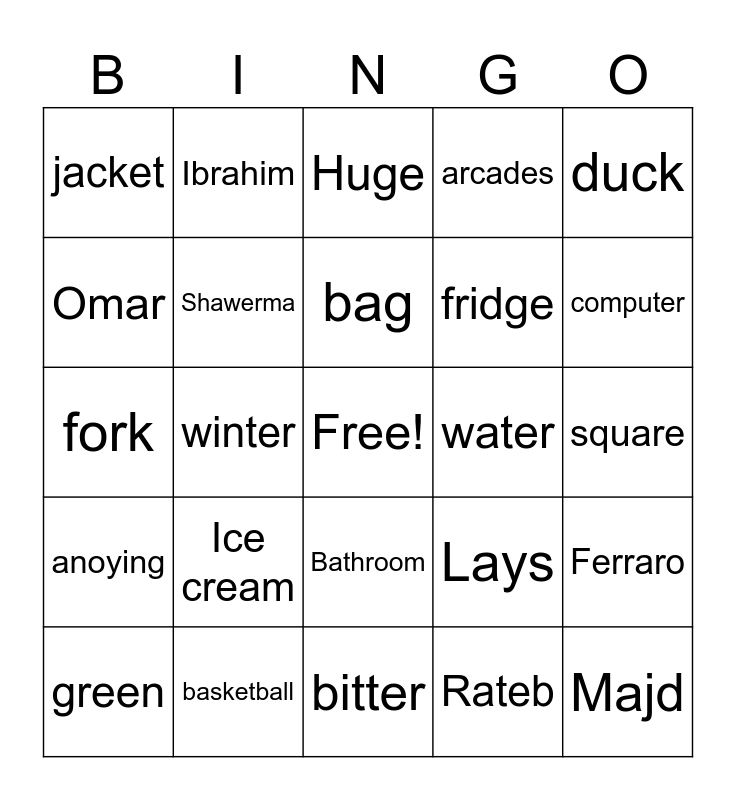 This bingo card has a free space and 53 words: George, Majd, Suhail, Rateb, Ice cream, Chips, Ibrahim, Yara, Omar, Batates, Shawerma, Todools, Ferraro, Lays, blue, green, bag, water, bali, duck, winter, spring, fridge, jacket, coach, basketball, football, private, laptop, computer, charger, bingozz, taco, lobster, germany, USA, arcades, bitter, Huge, Small, Medium, x-large, square, middle, Kitchen, Bathroom, basement, table, fork, anoying, brother, teta and gido.