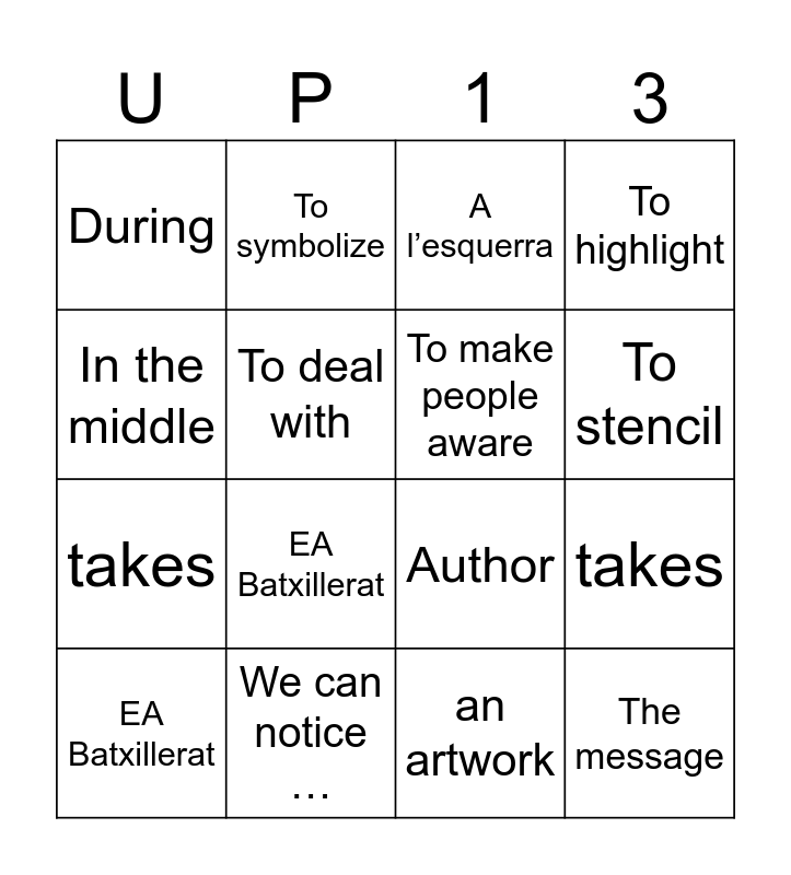 This bingo card has 92 words: a drawing, in the background, in the foreground, a painting, a cartoon, a portrait, a comic strip, To entitle, A magazine, A cartoonist, To publish, To deal with, To show, takes, Frames, In the middle, A l’esquerra, On the right, At the bottom, A character, Mood, a headline, a bubble, a caption, To suggest, To make people aware, To highlight, Aim, To convey, To criticise, To focus on, What strikes me the most …, It makes me think of …, It reminds me of …, To symbolize, We can notice …, During, a mural, To stencil, dates, Author, The message, an artwork, To dislike, EA Batxillerat, English, a drawing, in the background, in the foreground, a painting, a cartoon, a portrait, a comic strip, To entitle, A magazine, A cartoonist, To publish, To deal with, To show, takes, Frames, In the middle, A l’esquerra, On the right, At the bottom, A character, Mood, a headline, a bubble, a caption, To suggest, To make people aware, To highlight, Aim, To convey, To criticise, To focus on, What strikes me the most …, It makes me think of …, It reminds me of …, To symbolize, We can notice …, During, a mural, To stencil, Dates, Author, The message, an artwork, To dislike, EA Batxillerat and English.