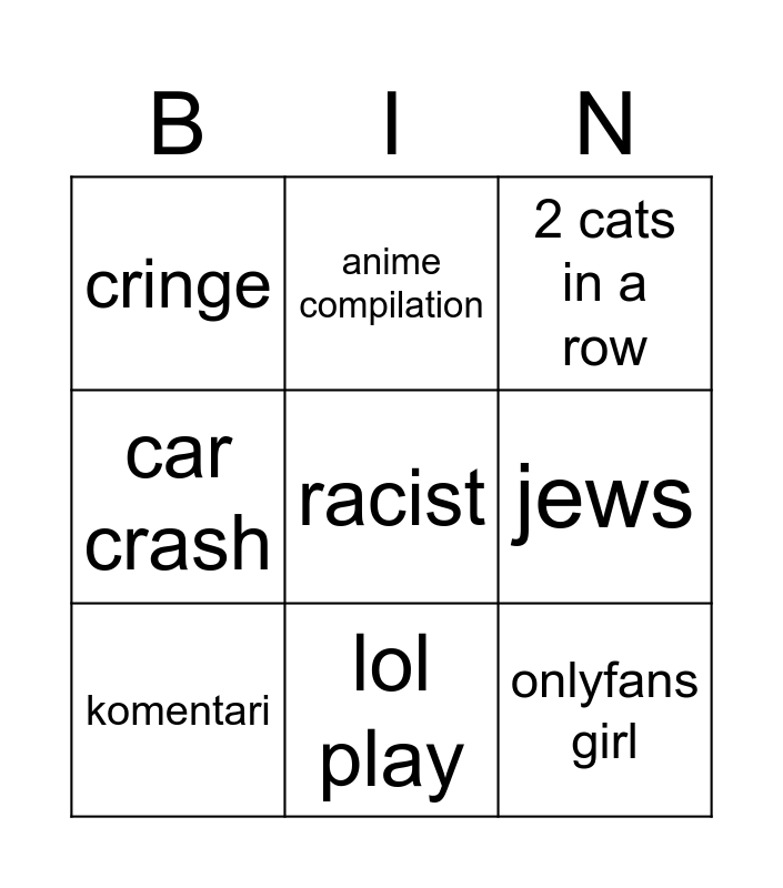 This bingo card has a free space and 8 words: car crash, anime compilation, jews, komentari, 2 cats in a row, cringe, lol play and onlyfans girl.