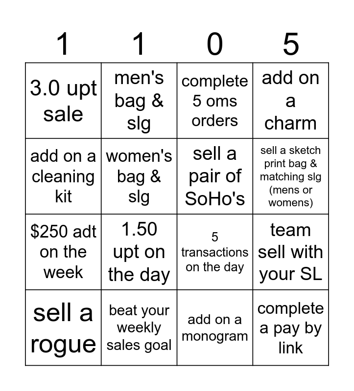 This bingo card has 16 words: beat your weekly sales goal, team sell with your SL, complete 5 oms orders, 3.0 upt sale, $250 adt on the week, men's bag & slg, 5 transactions on the day, add on a monogram, add on a cleaning kit, women's bag & slg, sell a rogue, add on a charm, 1.50 upt on the day, sell a sketch print bag & matching slg (mens or womens), sell a pair of SoHo's and complete a pay by link.