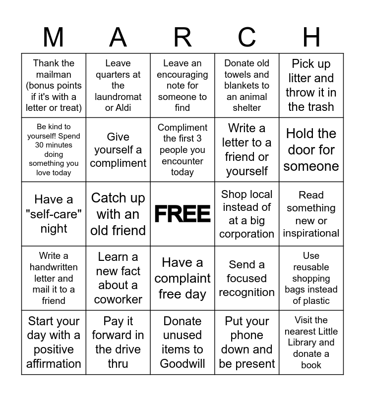 This bingo card has a free space and 24 words: Learn a new fact about a coworker, Pay it forward in the drive thru, Compliment the first 3 people you encounter today, Start your day with a positive affirmation, Pick up litter and throw it in the trash, Thank the mailman (bonus points if it's with a letter or treat), Be kind to yourself! Spend 30 minutes doing something you love today, Leave quarters at the laundromat or Aldi, Shop local instead of at a big corporation, Have a complaint free day, Write a letter to a friend or yourself, Have a "self-care" night, Send a focused recognition, Use reusable shopping bags instead of plastic, Give yourself a compliment, Put your phone down and be present, Read something new or inspirational, Leave an encouraging note for someone to find, Hold the door for someone, Catch up with an old friend, Visit the nearest Little Library and donate a book, Write a handwritten letter and mail it to a friend, Donate old towels and blankets to an animal shelter and Donate unused items to Goodwill.