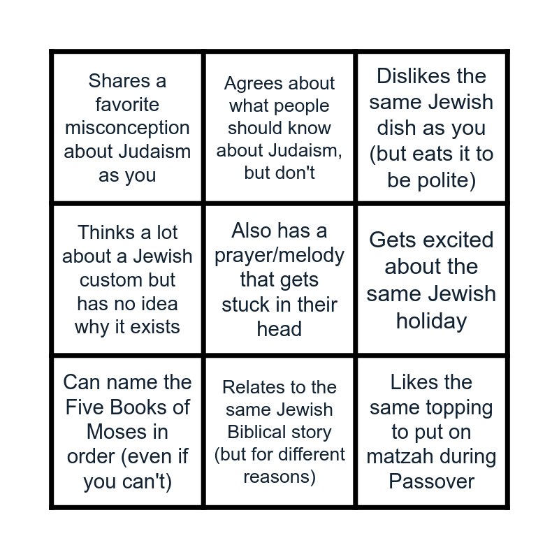 This bingo card has 9 words: Can name the Five Books of Moses in order (even if you can't), Dislikes the same Jewish dish as you (but eats it to be polite), Agrees about what people should know about Judaism, but don't, Thinks a lot about a Jewish custom but has no idea why it exists, Shares a favorite misconception about Judaism as you, Gets excited about the same Jewish holiday, Also has a prayer/melody that gets stuck in their head, Likes the same topping to put on matzah during Passover and Relates to the same Jewish Biblical story (but for different reasons).
