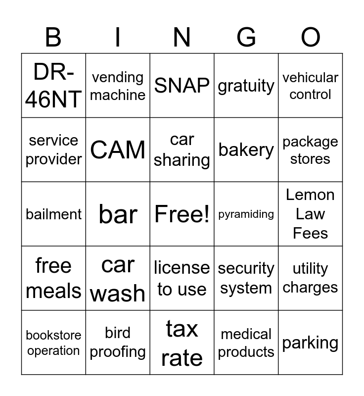 This bingo card has a free space and 24 words: car wash, bird proofing, car sharing, bookstore operation, vehicular control, DR-46NT, service provider, vending machine, pyramiding, license to use, bakery, bailment, security system, utility charges, CAM, medical products, Lemon Law Fees, SNAP, package stores, bar, parking, free meals, gratuity and tax rate.