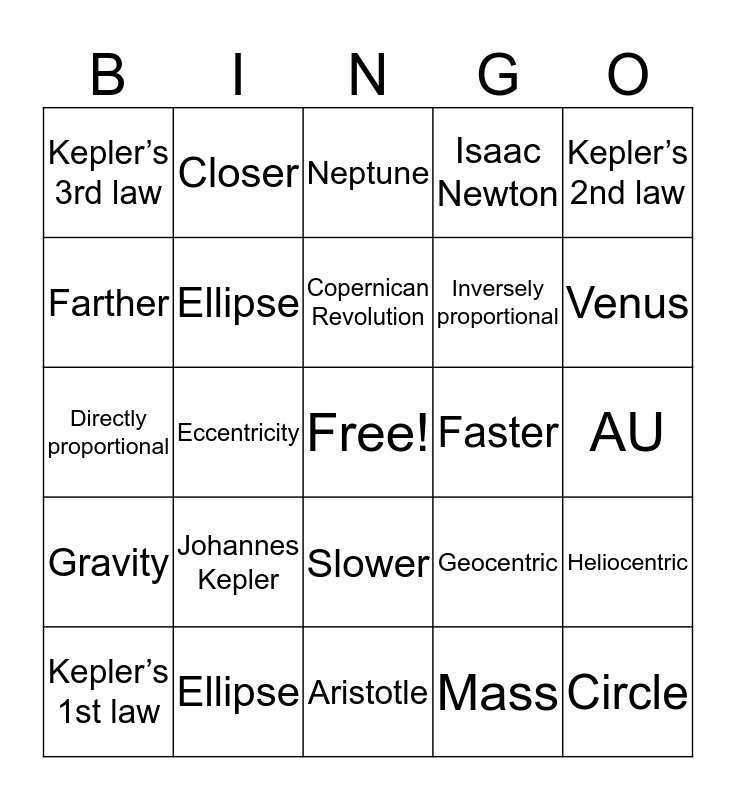 This bingo card has a free space and 25 words: Johannes Kepler, Aristotle, Copernican Revolution, Kepler’s 1st law, Kepler’s 2nd law, Kepler’s 3rd law, Farther, Closer, Faster, Slower, Inversely proportional, Directly proportional, Geocentric, Heliocentric, Ellipse, Focus, AU, Neptune, Venus, Eccentricity, Circle, Ellipse, Gravity, Isaac Newton and Mass.
