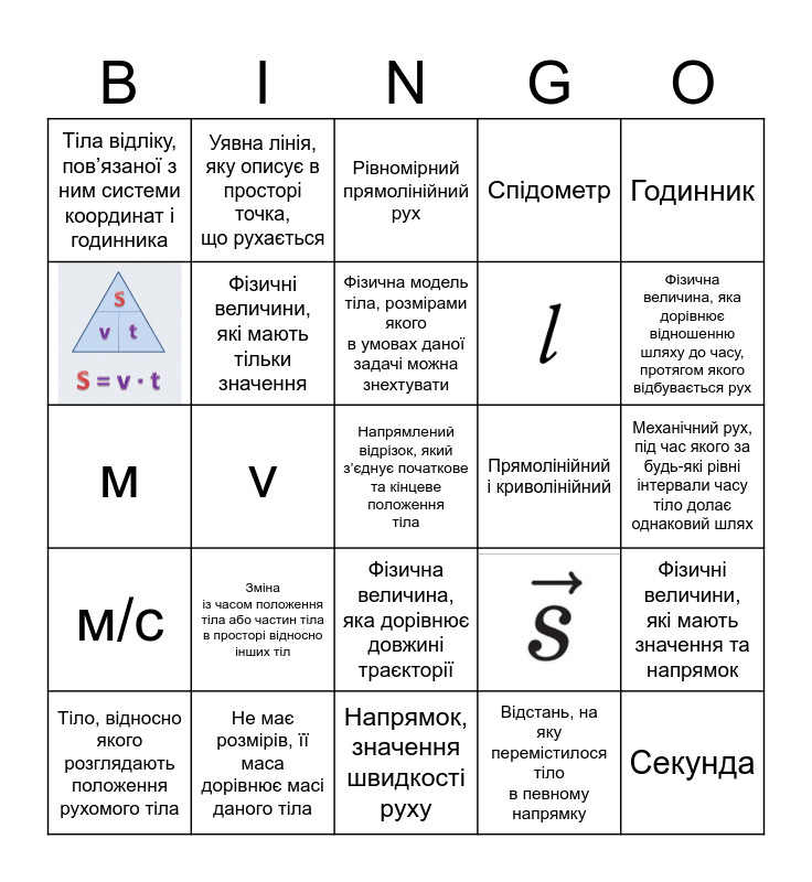 This bingo card has 3 images, a free space and 21 words: Зміна із часом положення тіла або частин тіла в просторі відносно інших тіл, Не має розмірів, її маса дорівнює масі даного тіла, Фізична модель тіла, розмірами якого в умовах даної задачі можна знехтувати, Тіло, відносно якого розглядають положення рухомого тіла, Годинник, Тіла відліку, пов’язаної з ним системи координат і годинника, Уявна лінія, яку описує в просторі точка, що рухається, Прямолінійний і криволінійний, Фізична величина, яка дорівнює довжині траєкторії, м, Фізичні величини, які мають значення та напрямок, Фізичні величини, які мають тільки значення, Відстань, на яку перемістилося тіло в певному напрямку, Механічний рух, під час якого за будь-які рівні інтервали часу тіло долає однаковий шлях, Рівномірний прямолінійний рух, Фізична величина, яка дорівнює відношенню шляху до часу, протягом якого відбувається рух, v, Секунда, м/с, Спідометр and Напрямок, значення швидкості руху.
