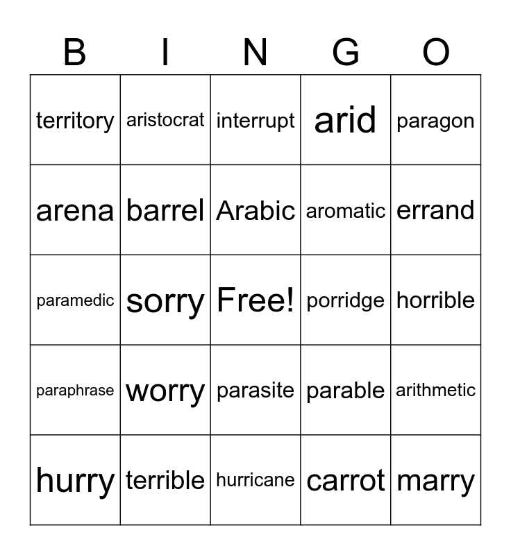 This bingo card has a free space and 29 words: hurry, correct, sorry, Harry, territory, interrupt, barrel, worry, porridge, terrible, horrible, marry, hurricane, carrot, errand, paragraph, parasite, paraphrase, paragon, paramedic, parable, aroma, aromatic, arena, arid, aristocrat, arithmetic, Arabic and marigold.