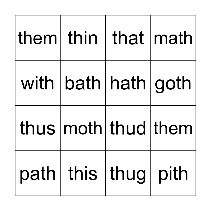 This bingo card has 16 words: this, them, that, them, thus, thin, thud, thug, with, bath, path, math, moth, goth, hath and pith.