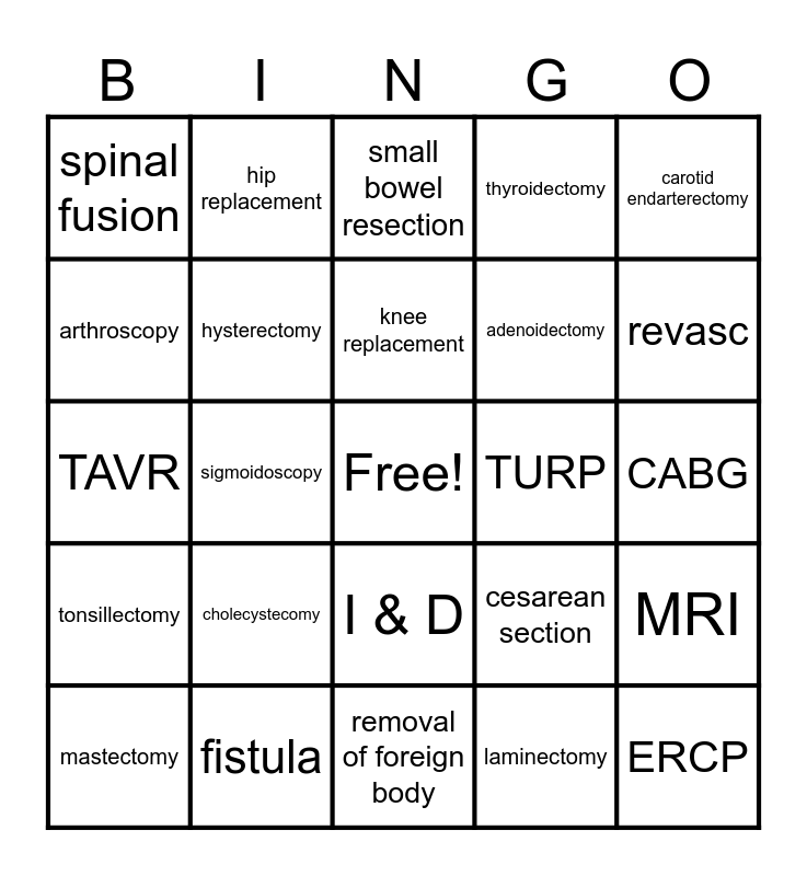 This bingo card has a free space and 34 words: appendectomy, laminectomy, prostatectomy, hernia repair, tonsillectomy, hysterectomy, carotid endarterectomy, mastectomy, hip replacement, stent placement, knee replacement, small bowel resection, gastric sleeve, ablation, TURP, revasc, fistula, TAVR, cholecystecomy, cesarean section, I & D, biopsy, spinal fusion, CABG, removal of foreign body, ERCP, thyroidectomy, thoracotomy, adenoidectomy, arthroscopy, bronchoscopy, sigmoidoscopy, MRI and rectal abscess.