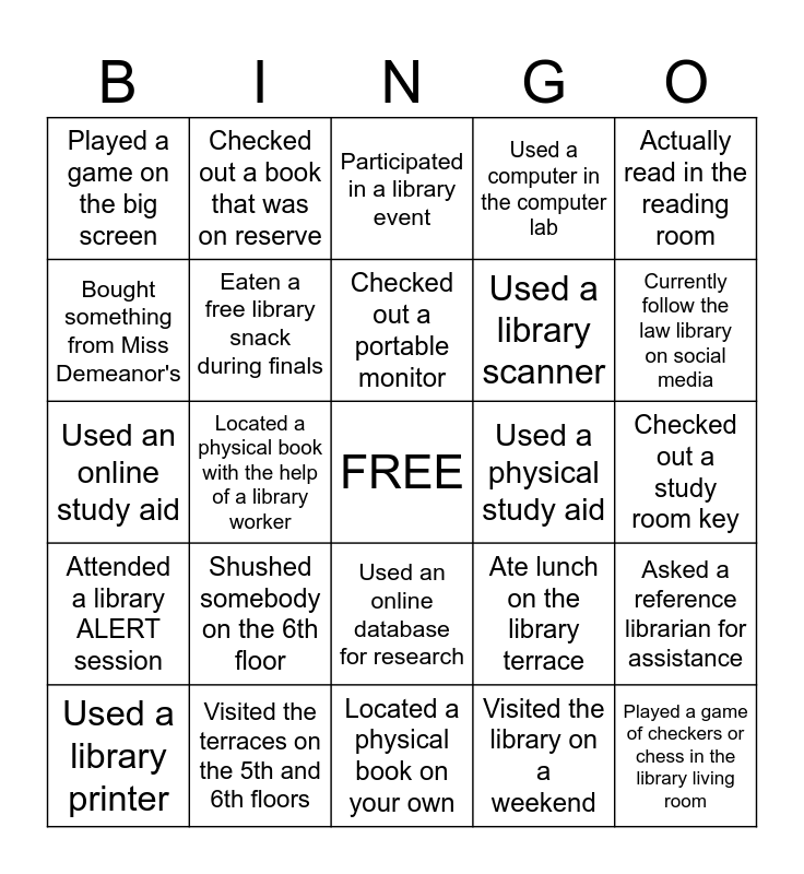 This bingo card has a free space and 24 words: Shushed somebody on the 6th floor, Visited the terraces on the 5th and 6th floors, Checked out a portable monitor, Used a library printer, Actually read in the reading room, Played a game on the big screen, Bought something from Miss Demeanor's, Checked out a book that was on reserve, Used a physical study aid, Used an online database for research, Used a library scanner, Used an online study aid, Ate lunch on the library terrace, Asked a reference librarian for assistance, Eaten a free library snack during finals, Visited the library on a weekend, Checked out a study room key, Participated in a library event, Currently follow the law library on social media, Located a physical book with the help of a library worker, Played a game of checkers or chess in the library living room, Attended a library ALERT session, Used a computer in the computer lab and Located a physical book on your own.