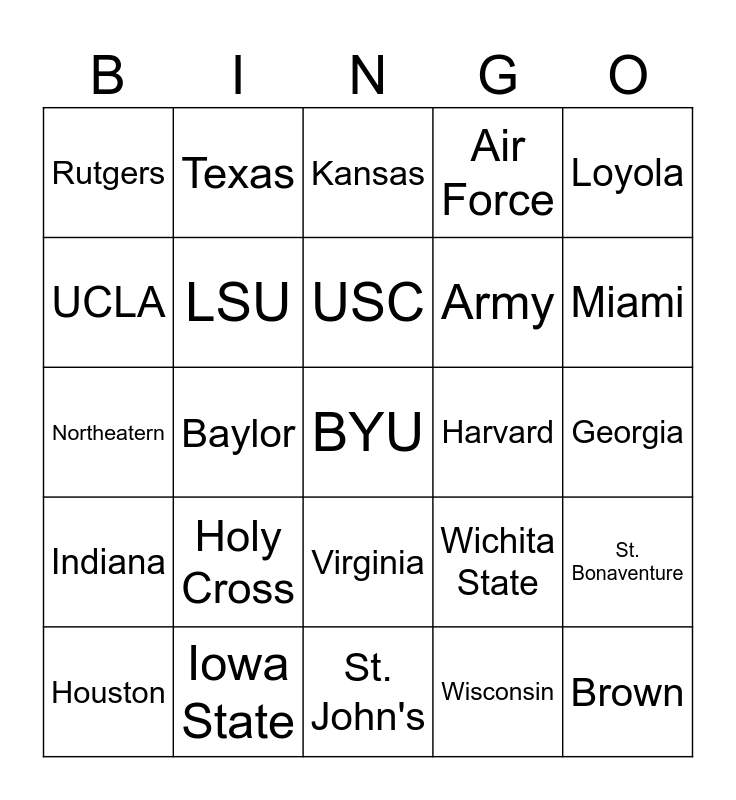 This bingo card has 96 words: Boston College, Duke, Clemson, Harvard, Florida State, Maryland, Georgia Tech, North Carolina, Gonzaga, Michigan, Michigan State, Ohio State, Free!, Miami, Califonia, UCLA, USC, Louisville, NC State, Notre Dame, Pitt, SMU, Stanford, Syracuse, Virginia, St. John's, Wake Forest, Rutgers, Temple, Rice, Memphis, Wichita State, Fordham, George Mason, Loyola, UMass, St. Bonaventure, Arizona State, Arizona, Baylor, Cincinnati, Houston, BYU, Iowa State, Indiana, Kansas, Oklahoma State, Texas Tech, Kansas State, Utah, West Virginia, Penn State, Butler, Creighton, DePaul, Georgetown, Marquette, Providence, Seton Hall, UConn, Villanova, Xavier, Iowa, Minnesota, Nebraska, Oregon, Northwestern, Purdue, Washington, Wisconsin, Brown, Dartmouth, Cornell, Columbia, Princeton, Yale, Alabama, LSU, Navy, Army, Air Force, UNLVFresno State, Boise State, Tennessee, BU, Northeatern, Holy Cross, Colgate, Arkansas, Georgia, Kentucky, Florida, Ole Miss, Texas A&M, Texas and Vanderbilt.