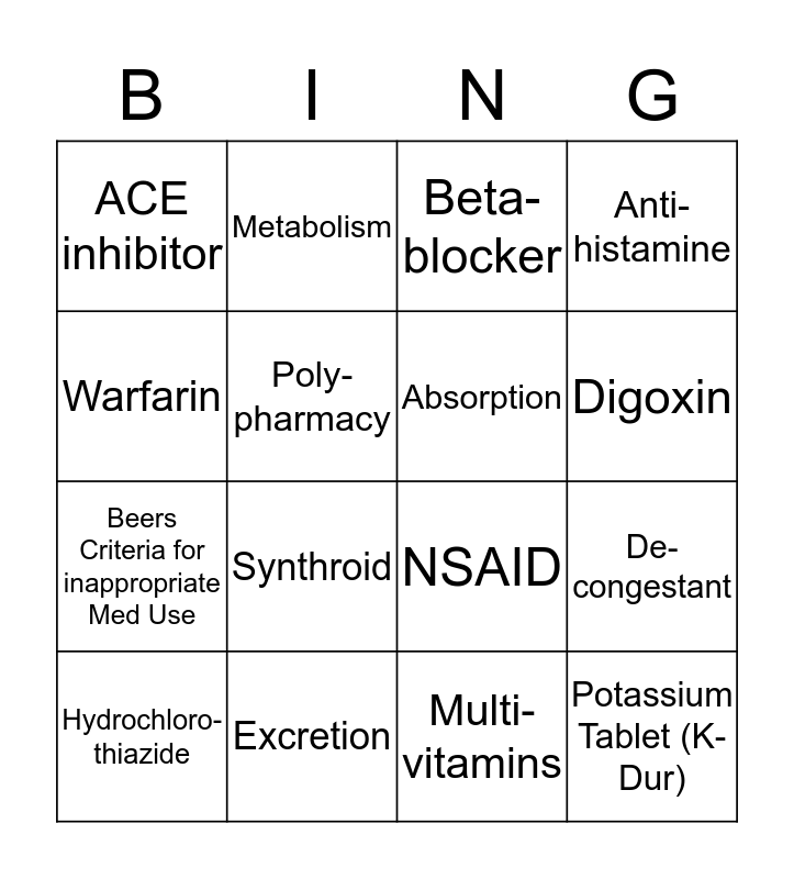 This bingo card has a free space and 15 words: Hydrochloro-thiazide, Potassium Tablet (K-Dur), Beta- blocker, ACE inhibitor, Digoxin, Warfarin, Synthroid, Multi-vitamins, Poly- pharmacy, Beers Criteria for inappropriate Med Use, De- congestant, Anti- histamine, Absorption, Metabolism and Excretion.