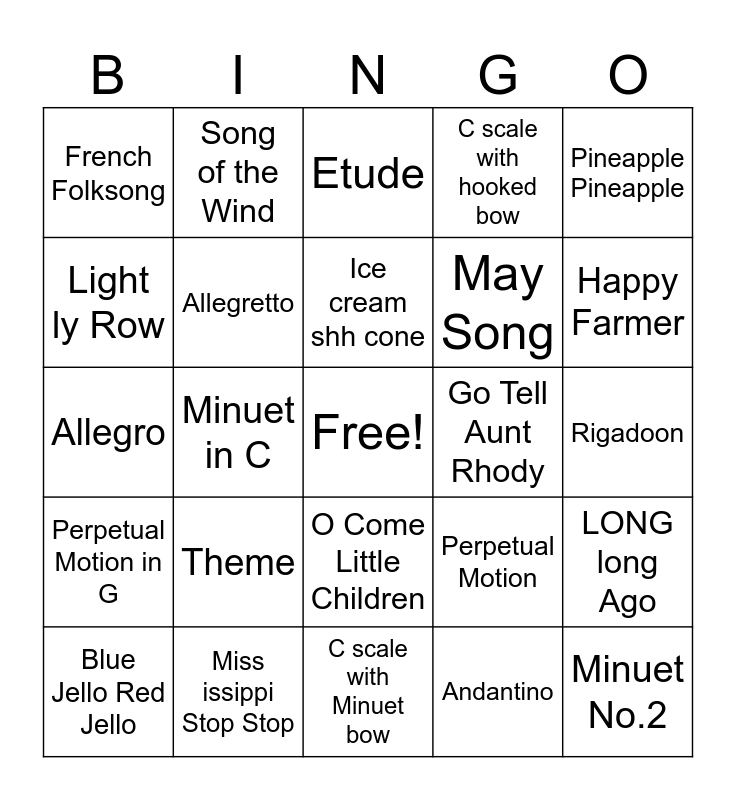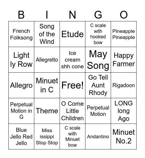 This bingo card has a free space and 24 words: Theme, Miss issippi Stop Stop, Ice cream shh cone, Blue Jello Red Jello, Pineapple Pineapple, French Folksong, Light ly Row, Song of the Wind, Go Tell Aunt Rhody, O Come Little Children, May Song, Allegro, Perpetual Motion, LONG long Ago, Allegretto, Andantino, Rigadoon, Etude, Happy Farmer, Minuet in C, Minuet No.2, Perpetual Motion in G, C scale with hooked bow and C scale with Minuet bow.