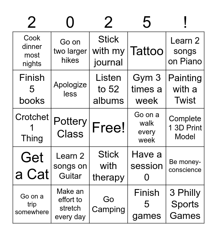 This bingo card has a free space and 24 words: Learn 2 songs on Guitar, Make an effort to stretch every day, Listen to 52 albums, Go on a trip somewhere, Learn 2 songs on Piano, Cook dinner most nights, Finish 5 books, Go on two larger hikes, Go on a walk every week, Stick with therapy, Gym 3 times a week, Crotchet 1 Thing, Have a session 0, Be money-conscience, Apologize less, Finish 5 games, Complete 1 3D Print Model, Stick with my journal, Painting with a Twist, Pottery Class, 3 Philly Sports Games, Get a Cat, Tattoo and Go Camping.
