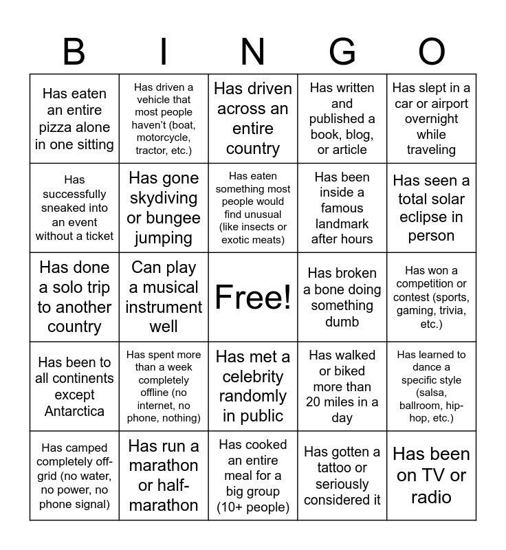 This bingo card has a free space and 40 words: Has traveled to at least 10 countries, Has done a solo trip to another country, Can fluently speak three or more languages, Has gone skydiving or bungee jumping, Has run a marathon or half-marathon, Has met a celebrity randomly in public, Has eaten something most people would find unusual (like insects or exotic meats), Has been inside a volcano, cave, or deep canyon, Has slept in a car or airport overnight while traveling, Has been to all continents except Antarctica, Can play a musical instrument well, Has written and published a book, blog, or article, Has been on TV or radio, Has won a competition or contest (sports, gaming, trivia, etc.), Has broken a bone doing something dumb, Has spent more than a week completely offline (no internet, no phone, nothing), Has hitchhiked before, Has eaten an entire pizza alone in one sitting, Has stayed awake for more than 36 hours straight, Has driven across an entire country, Has learned to dance a specific style (salsa, ballroom, hip-hop, etc.), Has gotten a tattoo or seriously considered it, Has been inside a famous landmark after hours, Has successfully sneaked into an event without a ticket, Has slept outside under the stars (without a tent), Has spontaneously booked a trip with less than 24 hours' notice, Has eaten a dish that was way too spicy but finished it anyway, Has been stuck in an elevator, Has given a speech or presentation to over 100 people, Has gone to a foreign country without knowing the language at all, Has helped a stranger in a big way while traveling, Has camped completely off-grid (no water, no power, no phone signal), Has been part of a flash mob or public performance, Has walked or biked more than 20 miles in a day, Has seen a total solar eclipse in person, Has cooked an entire meal for a big group (10+ people), Has been on a surprise trip without knowing the destination, Has gone swimming in a river, lake, or ocean at night, Has driven a vehicle that most people haven’t (boat, motorcycle, tractor, etc.) and Has kept in touch with a childhood best friend for over 15 years.