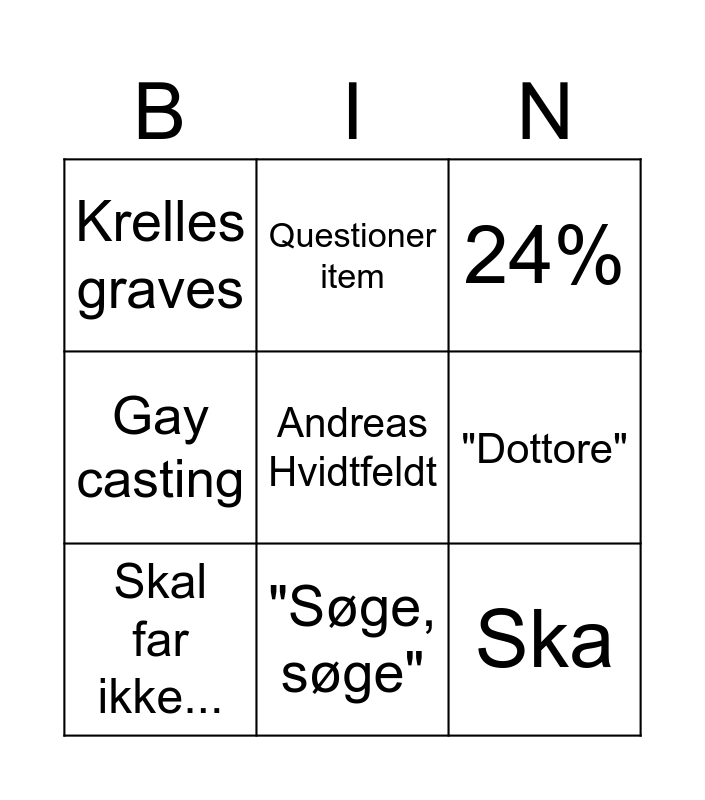 This bingo card has 10 words: "Søge, søge", 24%, Krelles graves, Andreas Hvidtfeldt, Gay casting, Skal far ikke..., Questioner item, FF 15, "Dottore" and Ska.