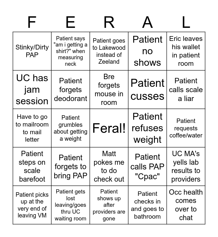 This bingo card has a free space and 24 words: Patient forgets to bring PAP, Patient gets lost leaving/goes thru UC waiting room, Bre forgets mouse in room, Patient picks up at the very end of leaving VM, Eric leaves his wallet in patient room, Stinky/Dirty PAP, UC has jam session, Patient says "am i getting a shirt?" when measuring neck, Patient refuses weight, Matt pokes me to do check out, Patient cusses, Have to go to mailroom to mail letter, Patient calls PAP "Cpac", UC MA's yells lab results to providers, Patient forgets deodorant, Patient checks in and goes to bathroom, Patient requests coffee/water, Patient goes to Lakewood instead of Zeeland, Patient calls scale a liar, Patient grumbles about getting a weight, Occ health comes over to chat, Patient steps on scale barefoot, Patient no shows and Patient shows up after providers are gone.