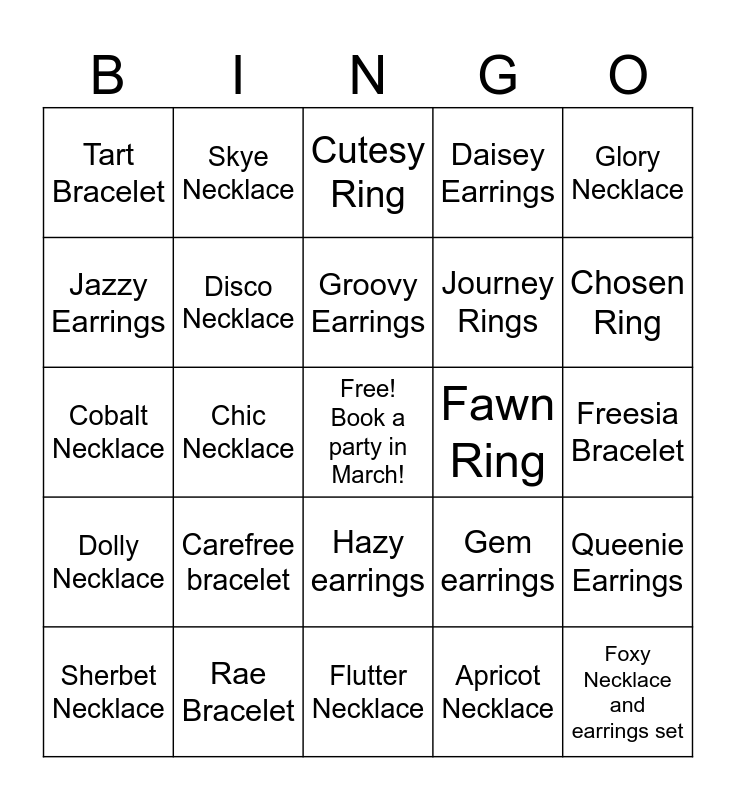 This bingo card has a free space and 24 words: Carefree bracelet, Rae Bracelet, Groovy Earrings, Sherbet Necklace, Glory Necklace, Tart Bracelet, Jazzy Earrings, Skye Necklace, Fawn Ring, Hazy earrings, Journey Rings, Cobalt Necklace, Gem earrings, Queenie Earrings, Disco Necklace, Apricot Necklace, Freesia Bracelet, Cutesy Ring, Chosen Ring, Chic Necklace, Foxy Necklace and earrings set, Dolly Necklace, Daisey Earrings and Flutter Necklace.