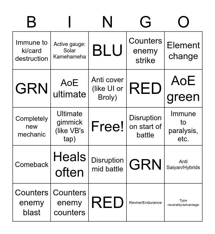 This bingo card has a free space and 27 words: GRN, BLU, RED, RED, GRN, BLU, Active gauge: Solar Kamehameha, Comeback, Disruption on start of battle, Anti Saiyan/Hybrids, Completely new mechanic, Counters enemy strike, Counters enemy blast, Counters enemy counters, AoE green, Autowins ki super dokabaki, AoE ultimate, Anti cover (like UI or Broly), Heals often, Immune to ki/card destruction, Immune to paralysis, etc., Revive/Endurance, Ultimate gimmick (like VB's tap), Type neutrality/advantage, Disruption mid battle, Element change and Multiple ultimates.