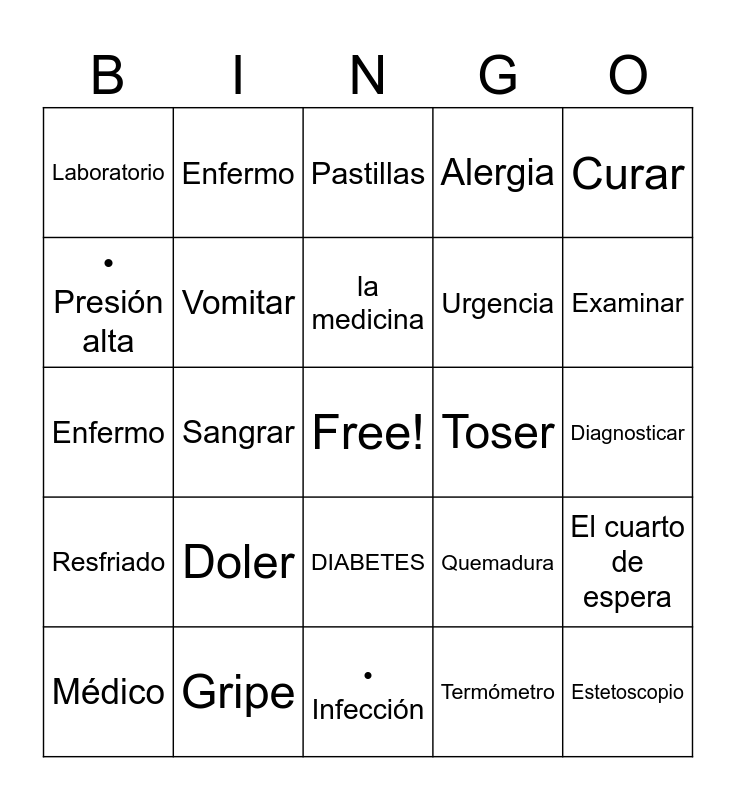 This bingo card has a free space and 29 words: Médico, Enfermera, Sangrar, Pulmón, Laboratorio, Pastillas, Vomitar, Doler, Toser, Gripe, Diagnosticar, Estetoscopio, • Infección, Termómetro, Examinar, Fractura, DIABETES, Resfriado, Curar, Enfermo, Quemadura, Asma, Urgencia, • Presión alta, Alergia, Enfermo, El cuarto de espera, la medicina and la salud.