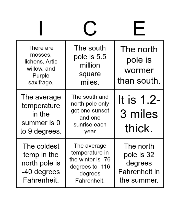This bingo card has 9 words: The coldest temp in the north pole is -40 degrees Fahrenheit., The north pole is wormer than south., The south pole is 5.5 million square miles., The average temperature in the summer is 0 to 9 degrees., There are mosses, lichens, Artic willow, and Purple saxifrage., It is 1.2-3 miles thick., The south and north pole only get one sunset and one sunrise each year, The north pole is 32 degrees Fahrenheit in the summer. and The average temperature in the winter is -76 degrees to -116 degrees Fahrenheit..
