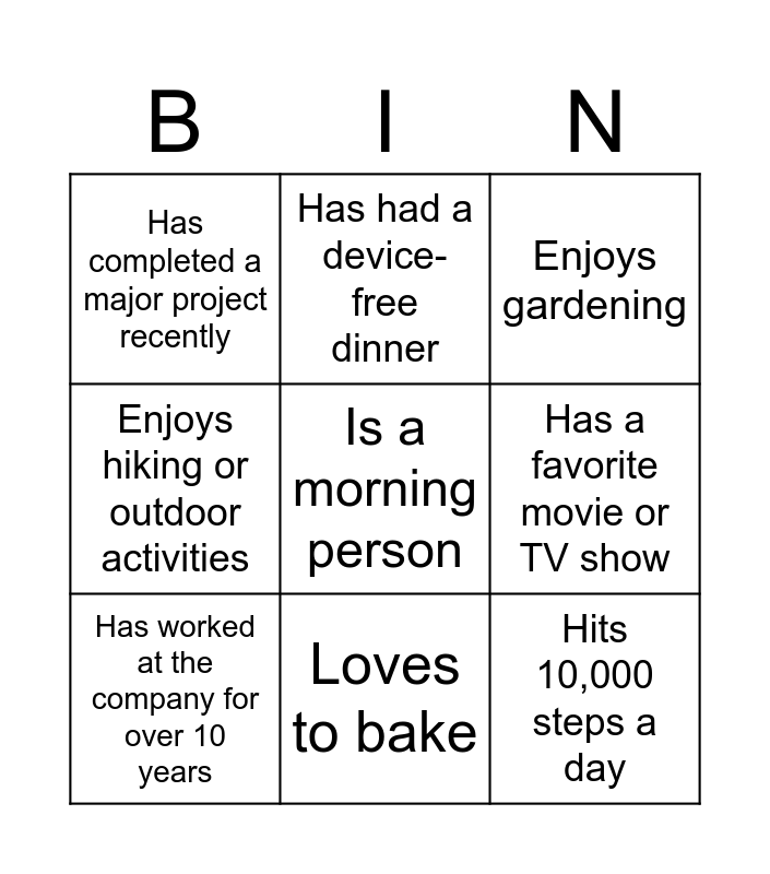 This bingo card has 37 words: Has visited more than 3 countries, Speaks more than two languages, Has a pet other than a cat or dog, Has worked at the company for over 10 years, Plays a musical instrument, Has run a marathon, Loves to bake, Has a unique hobby, Is a morning person, Has met a celebrity, Has a hidden talent, Enjoys hiking or outdoor activities, Has read more than 5 books this year, Is a fan of Auckland FC, Has a favorite movie or TV show, Has a collection of something, Has recently learned a new skill, Enjoys gardening, Goes to the same holiday spot every year, Favourite cuisine is Japanese, Has completed a major project recently, Has done a run or walk of 5km this year, Has been on a family outing this year, Has learned a new skill this year, Has attended a professional event, Drinks 2 liters of water a day, Has had a device-free dinner, Volunteers for a cause, Mentors a colleague, Does yoga or meditates daily, Has read 5 books this year, Has earned a certification, Has started an investment fund, Has a family game night, Tracks expenses weekly, Hits 10,000 steps a day and Has tried a new hobby.